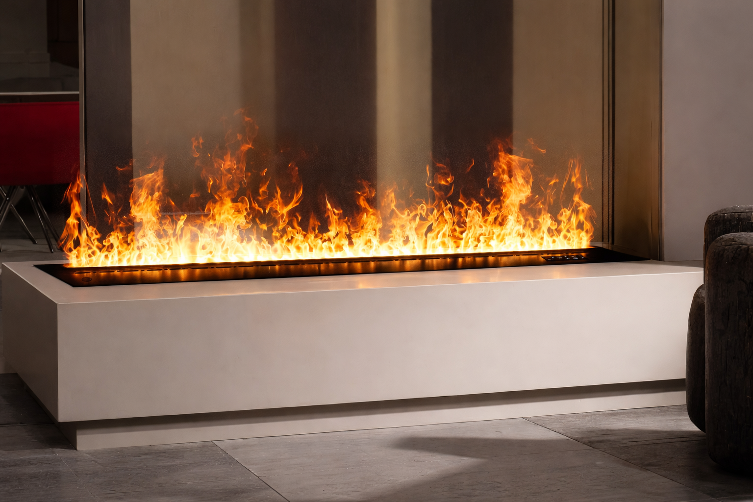 FRÉS 3D-vattenångteknik skapar en mycket realistisk flammeffekt som ser ut som riktig eld samtidigt som den är helt säker. Flamman brinner inte och avger ingen värme, vilket gör FRÉS-eldstäder lämpliga för hem, offentliga utrymmen och kommersiella miljöer.